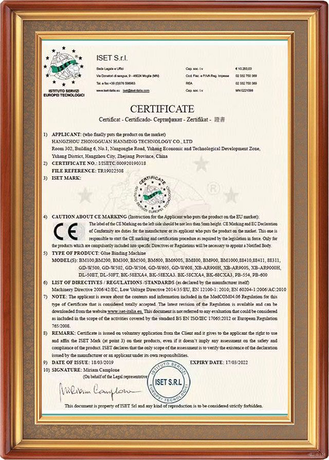 為了擴(kuò)大出口業(yè)務(wù),贏得國際市場尤其是要求苛刻的歐洲市場,我司明月系列膠裝機于2019年3月成功通過CE認(rèn)證,并獲得了歐盟CE認(rèn)證證書,為我司產(chǎn)品出口歐盟,打開國際市場創(chuàng)造了有力條件。
