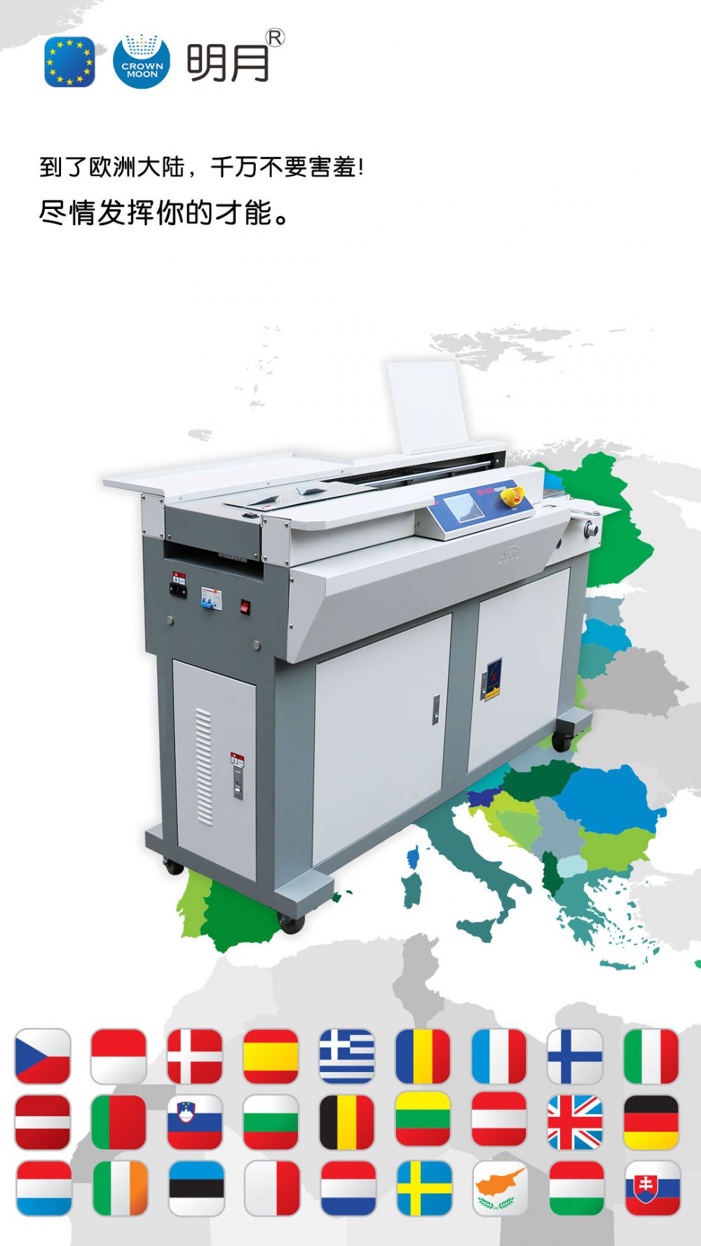 此次通過CE認(rèn)證的明月膠裝機系列產(chǎn)品,在智能無線膠裝技術(shù)及用戶體驗上,實現(xiàn)采用了多重“保障”屏障,從研發(fā)到選材到生產(chǎn)制造等方面,在用戶身邊構(gòu)建一道道保護(hù),以智能、安全、高效、環(huán)保、節(jié)能等優(yōu)勢深受客戶喜愛,產(chǎn)品遠(yuǎn)銷歐美、東亞、東南亞、中東等四十多個國家和地區(qū)。