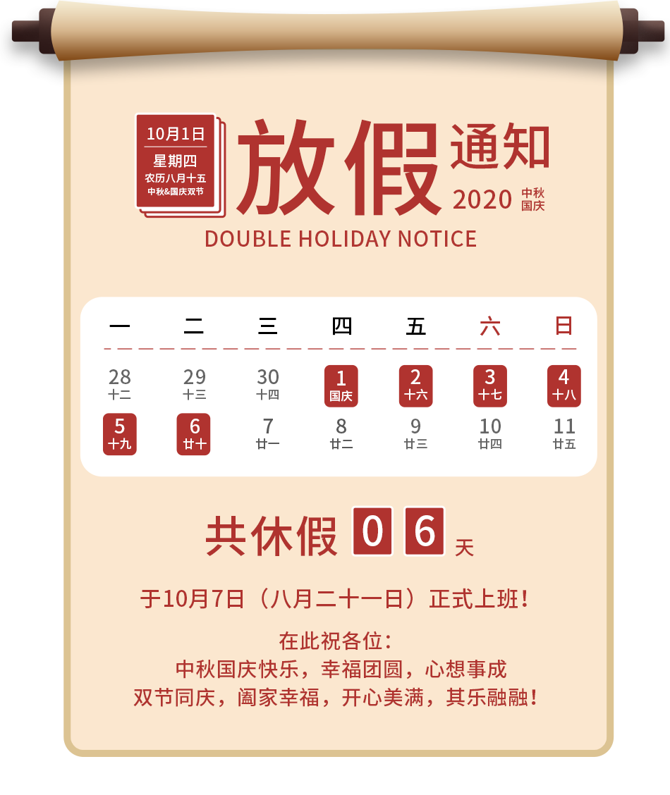 根據(jù)《國(guó)務(wù)院辦公廳關(guān)于2020年部分節(jié)假日安排》的通知精神,并結(jié)合我司實(shí)際情況,現(xiàn)將中秋節(jié)、國(guó)慶節(jié)放假時(shí)間安排有關(guān)事宜通知如下: