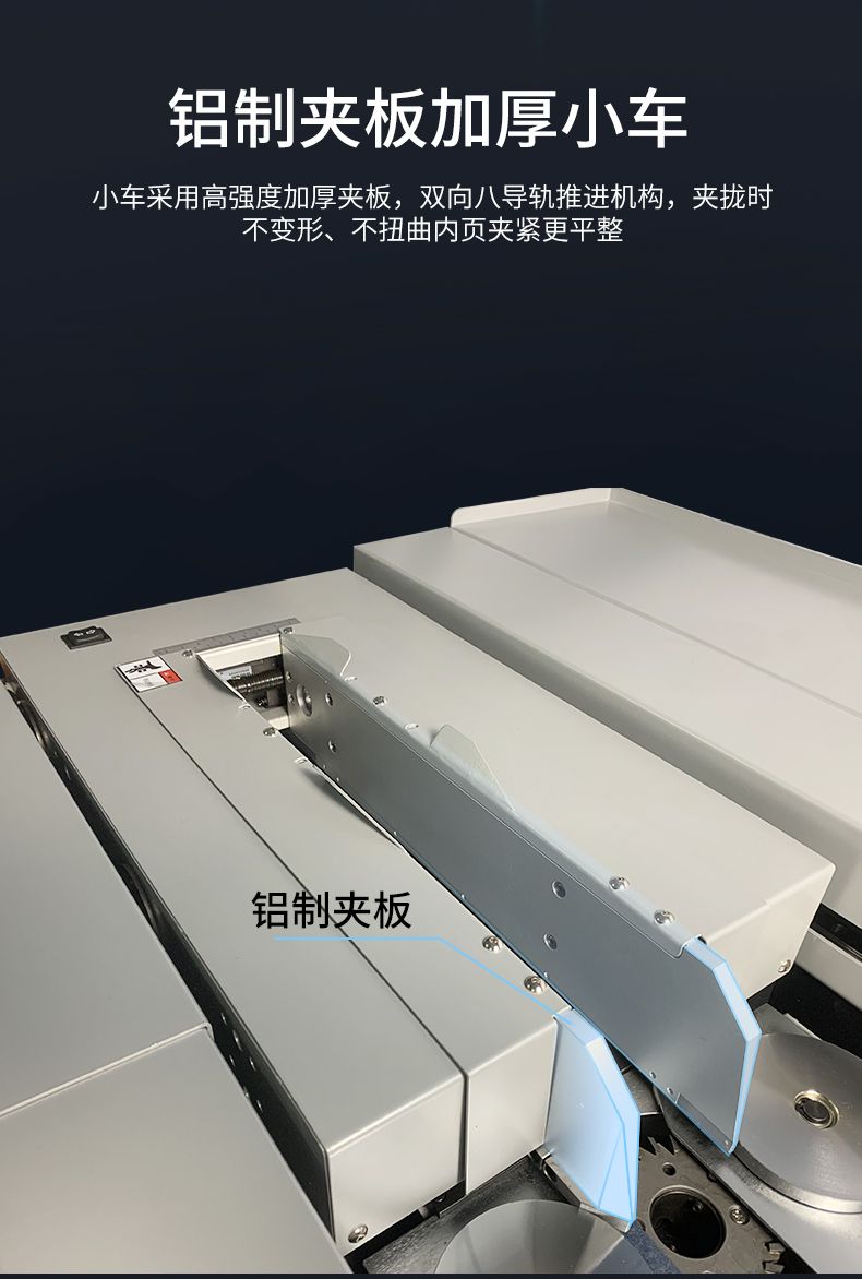 4.小車夾緊傳動(dòng),采用8導(dǎo)軌加3絲桿設(shè)計(jì)使裝訂書本時(shí)運(yùn)行平穩(wěn)不會(huì)晃動(dòng)。小車夾板采用加固鋁板結(jié)果不會(huì)出現(xiàn)變形的情況