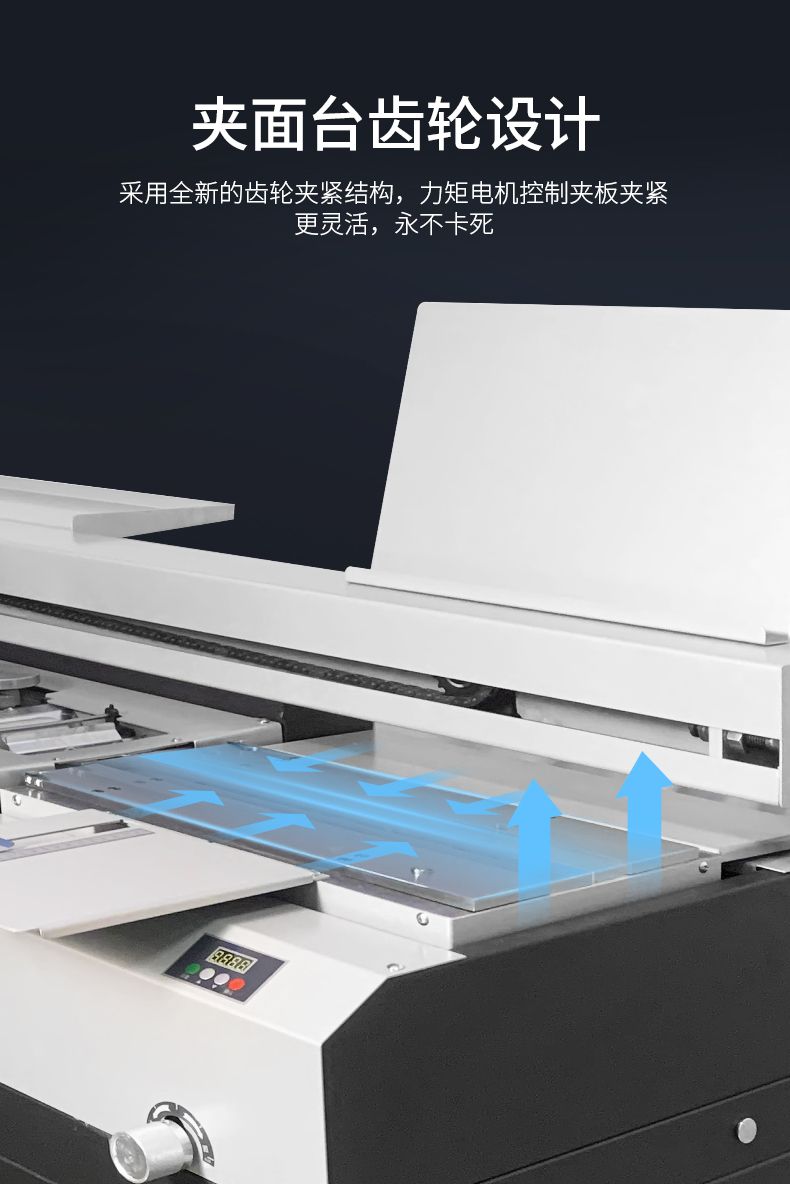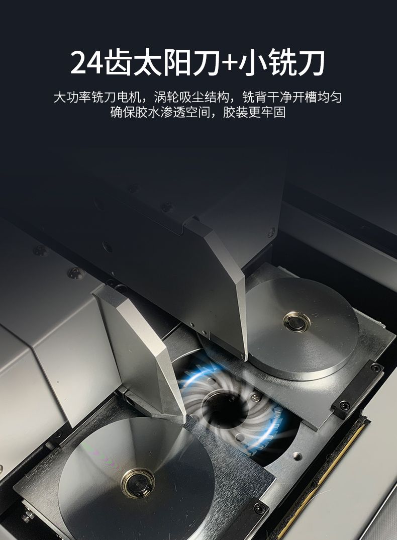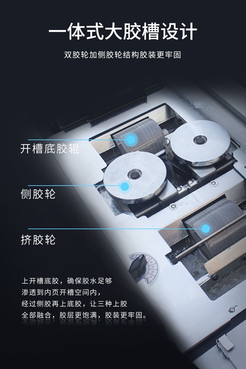 3.加大型膠槽雙膠輪設(shè)計(jì)帶側(cè)膠。按照BQ270膠槽設(shè)計(jì),第一膠輪做為銑刀刀槽上膠,保證膠水的滲透性比較強(qiáng)。第二膠輪書本背脊上膠,上膠效果比較好。
